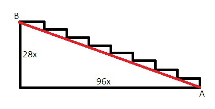 Решите пожалуйста!...............................Лестница соединяет точки. A и B. Высота каждой ступени равна 28 см, а длина 96 см. Расстояние между точками A и В составляет 15 м. Найдите высоту, на которую поднимается лестница (в метрах).