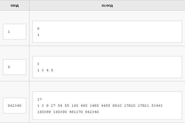 Во второй строке выведите k+1 число, последовательно получающиеся при выполнении операций. Первое из них должно быть равно 1, а последнее N. Если решений несколько, выведите любое из них.