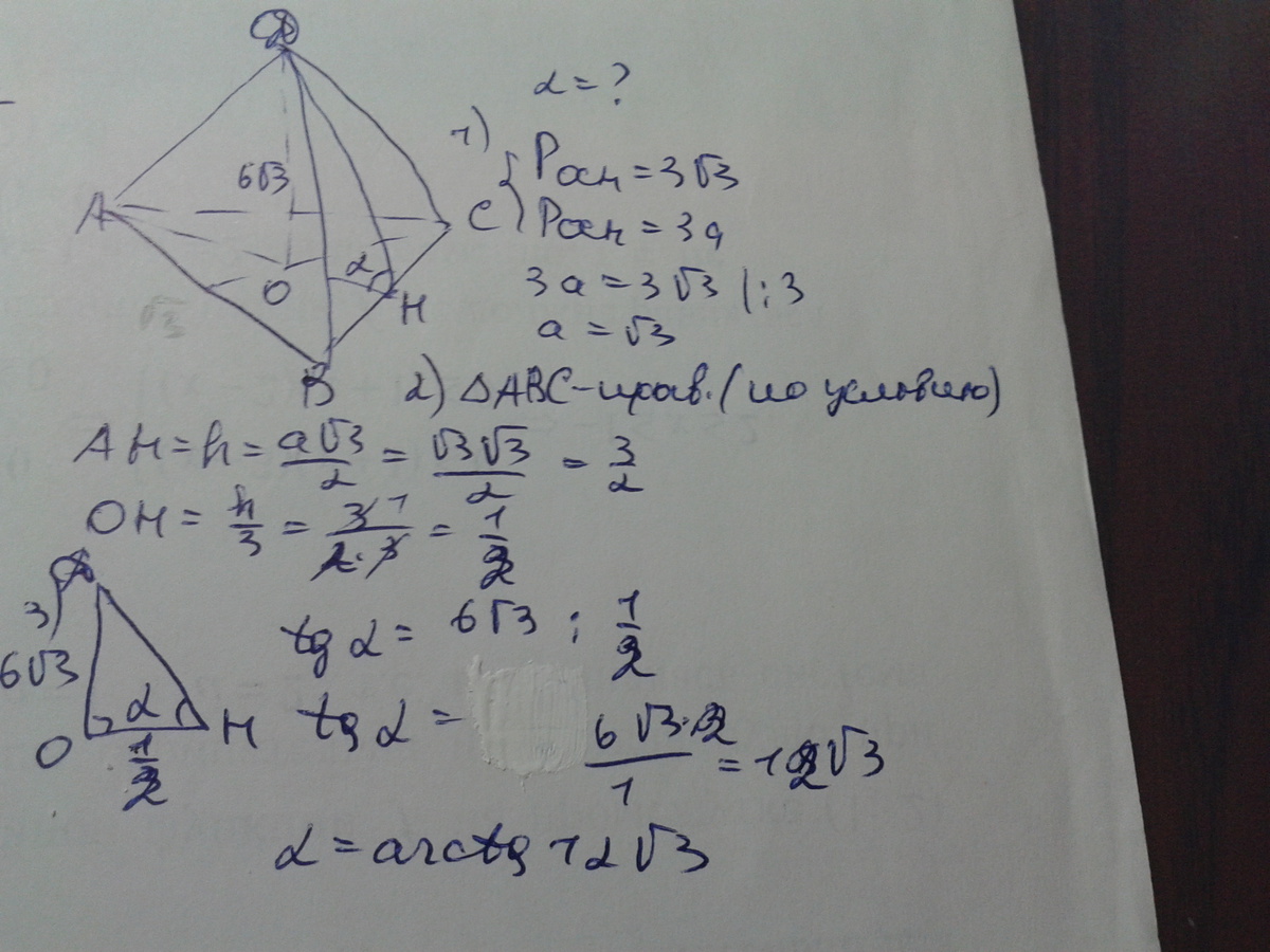 найдите величину двугранного угла при ребре основания правильной пирамиды DABC с периметром основания 36корень из 3 и высотой 6корень из 3