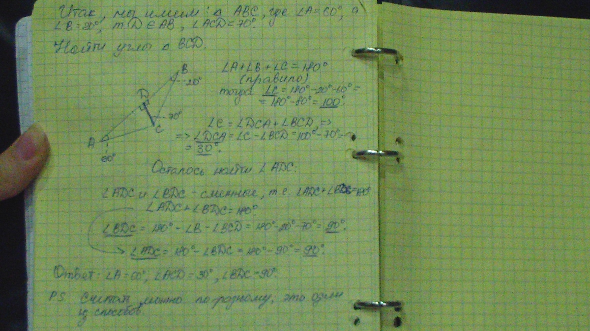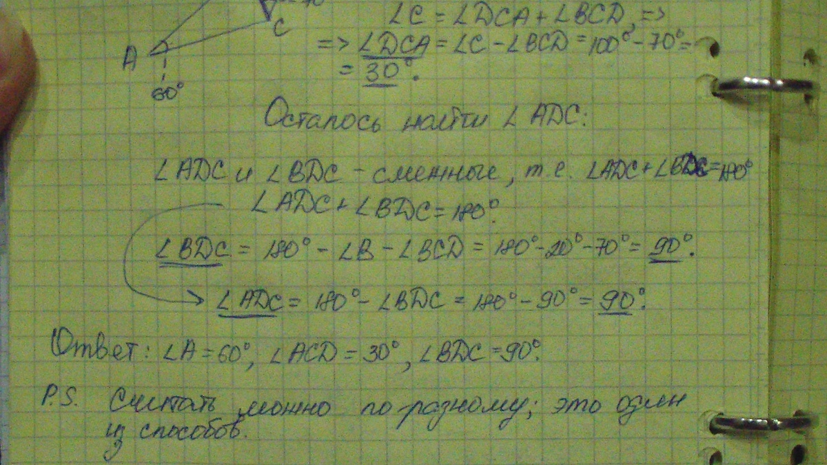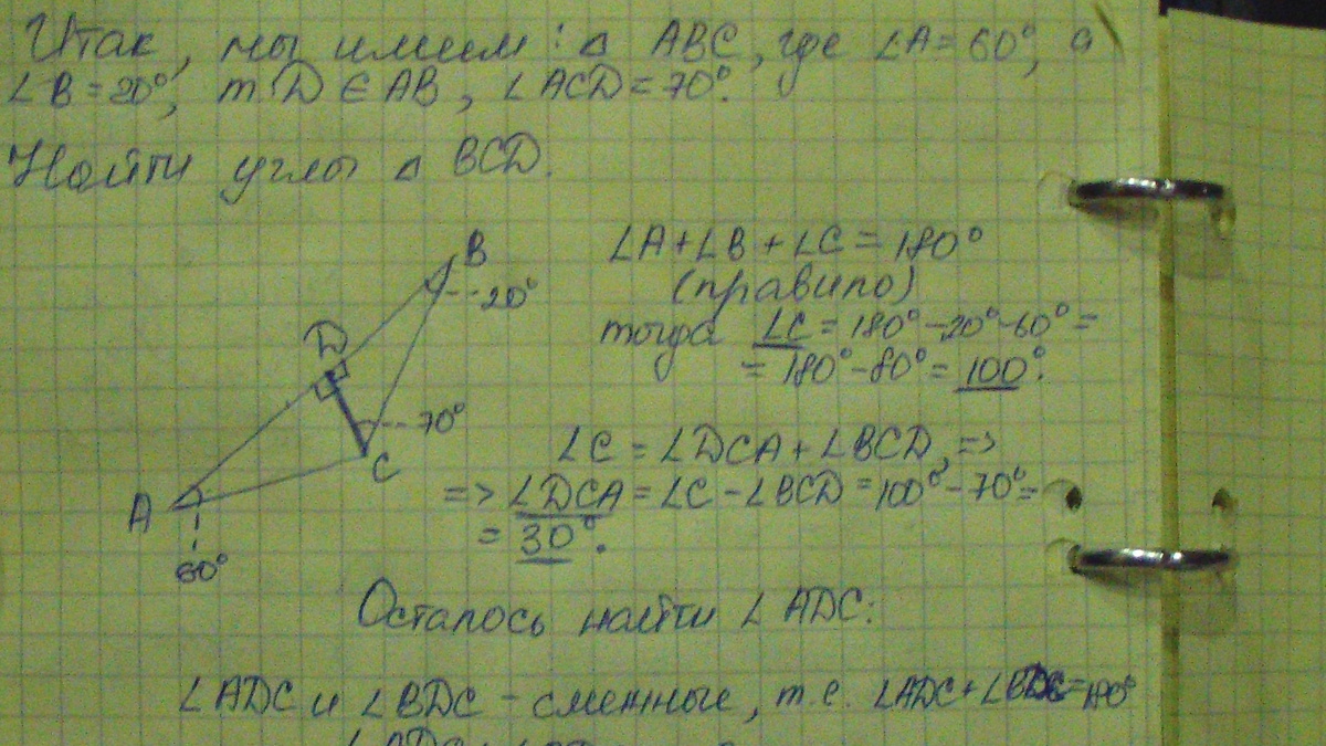 На стороне АВ треугольника АВС, в котором угол А=60 градусам и угол В=20 градусам,отмечена точка D так, что угол АСD=70 градусам. Найдите углы треугольника ВСD.