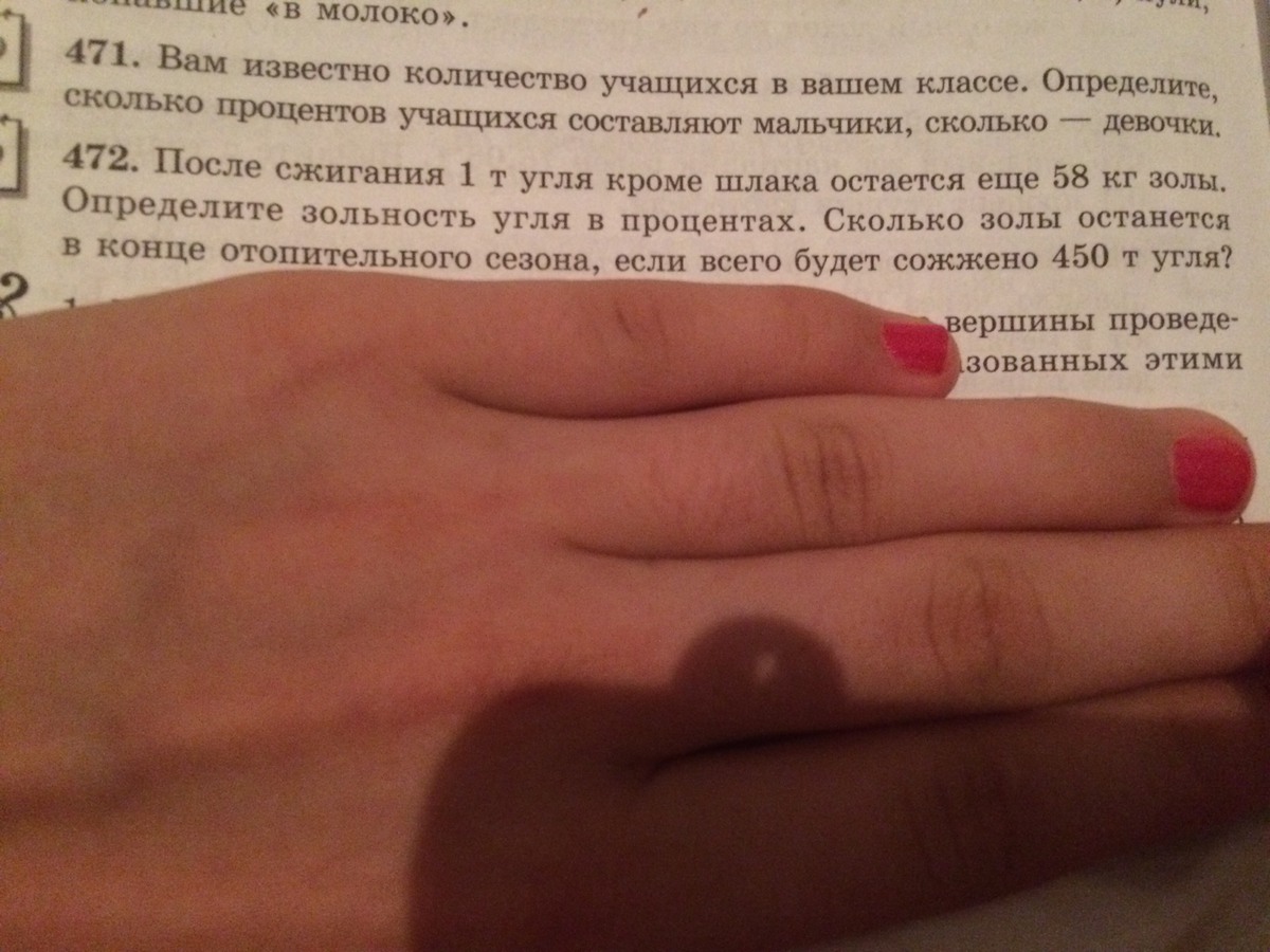 471) например, в классе 25 человек => это 100% ; мальчиков-10 человек, девочек-15. Считаем % мальчиков- составим пропорцию- 25-100/10-х (х-%мальчиков) => по правилам пропорции делаем умножение "на крест" получается 25х=1000 х=1000/25 х=40 => мальчиков 40%. Ну а сколько девочек, можно просто вычесть из 100%-40%=60% Ответ:мальчиков 40%, девочек 60%