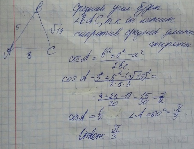 Дан треугольник с длинами 5.3 и корень из 19. Определите в радианах средний по величине угол треугольника.