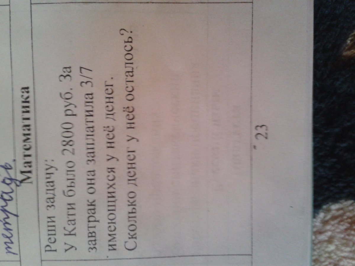 У Кати было 2800 руб. За завтрак она заплатила 3/7 имеющихся у нее денег. Сколько денег у нее осталось?