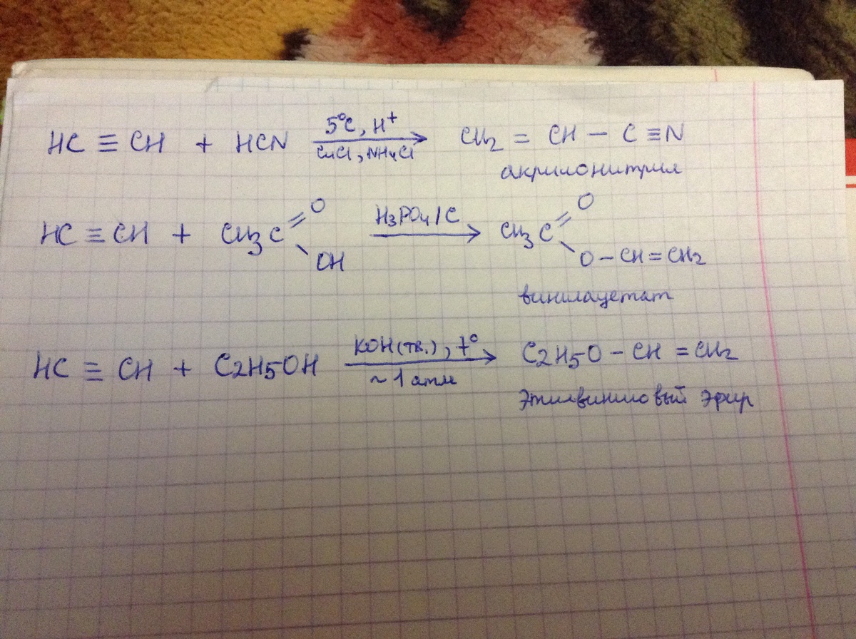 Какие соединения образуются при взаимодействии ацетилена со следующими веществами: синильной кислотой, уксусной кислотой, этанолом? Укажите условия протекания реакций.