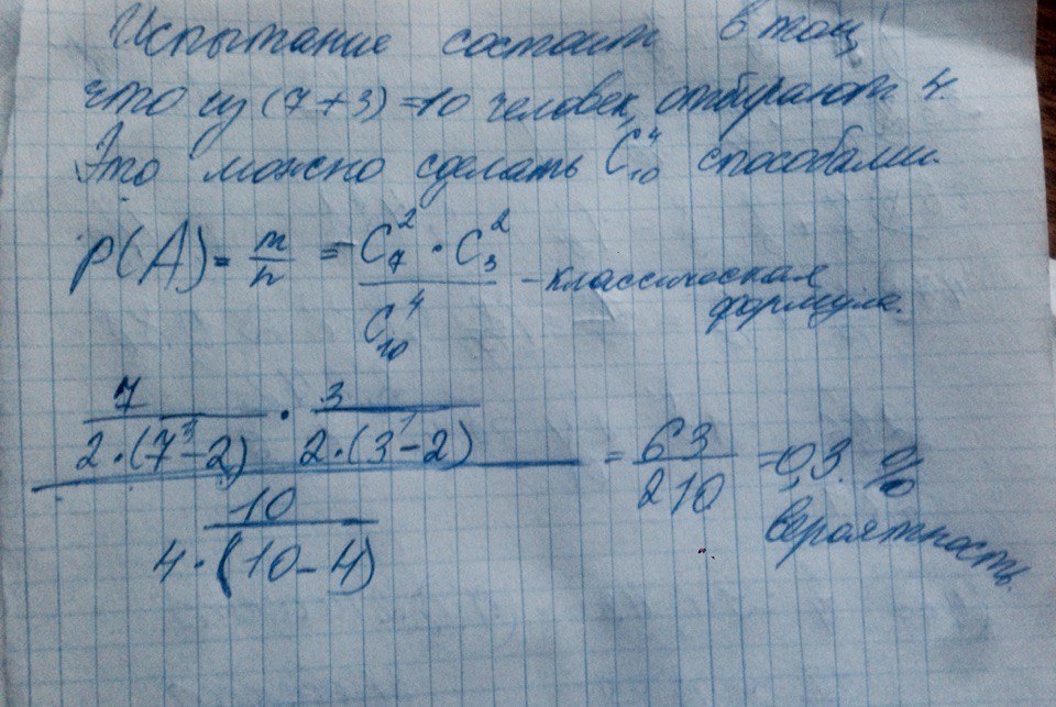 В школьном хоре поют 7 мальчиков и 3 девочки. По жребию выбирают 4 человека для участия в гала-концерте. Какова вероятность что среди отобранных певцов окажется 2 мальчика и 2 девочки.