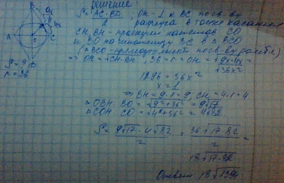 Окружность,вписанная в ромб, делит точкой касания сторону в отношении 9:4. Найдите площадь ромба,если радиус окружности равен 36 см.