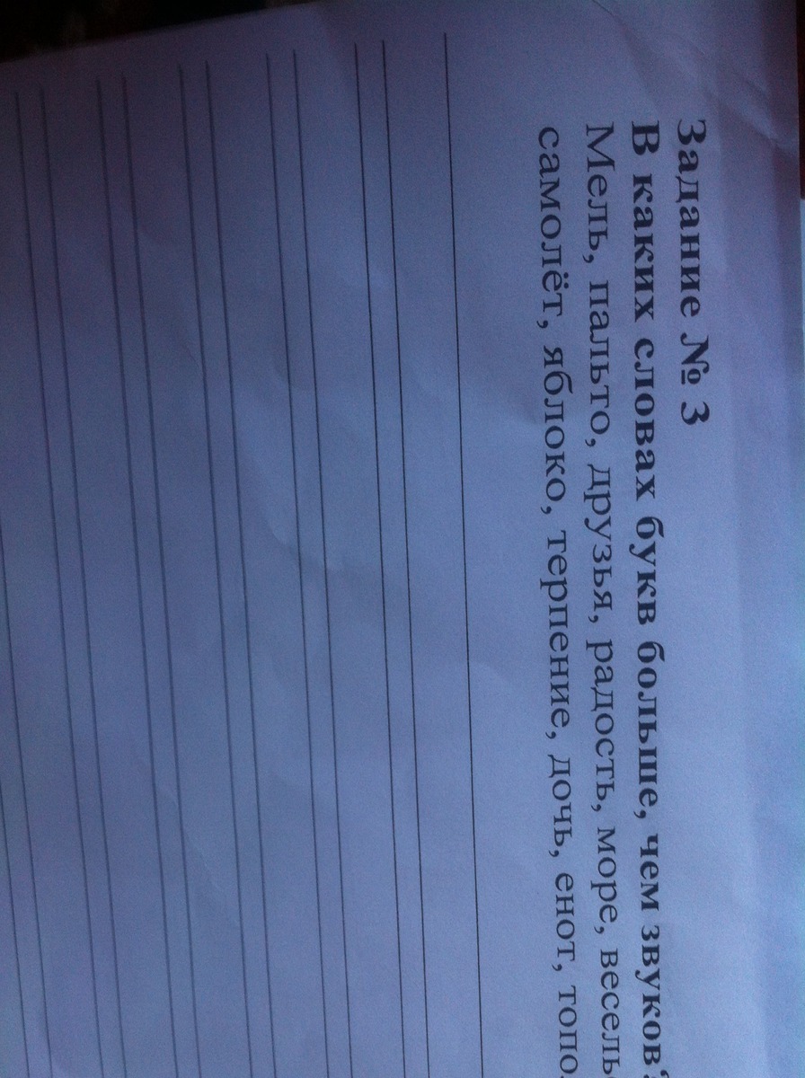 № 3: Букв больше, чем звуков в словах: "мель" [м`эл`] - 4 б., 3 зв., "пальто" [пал`то] - 6 б., 5 зв., "радость" [радас`т`] - 7 б., 6 зв., "дочь" [доч`] - 4 б., 3 зв., "тополь" [топал`] - 6 б., 5 зв.