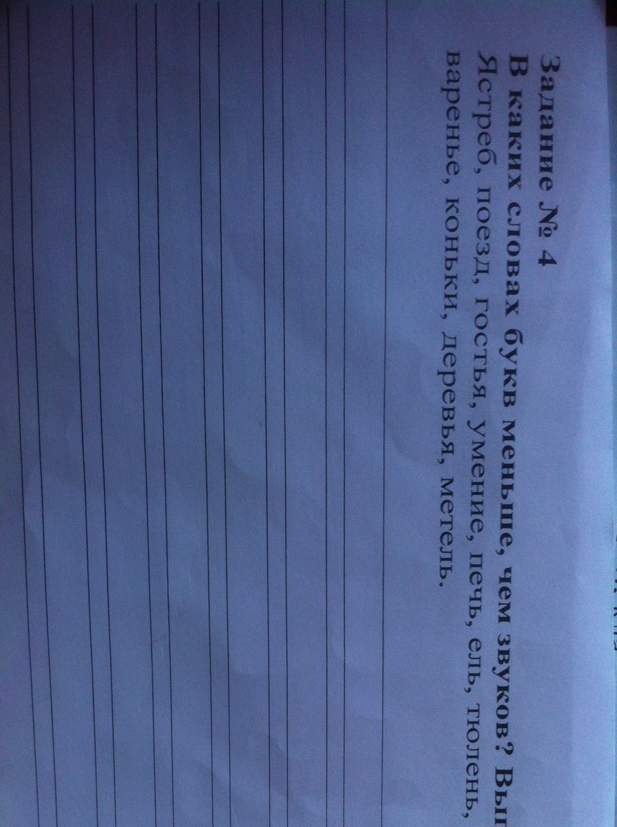 № 4: Букв меньше, чем звуков в словах: "ястреб" [й`астр`ип] - 6 б., 7 зв., "поезд" [пой`ист] - 5 б., 6 зв., "умение" [ум`эн`ий`э] - 6 б., 7 зв.
