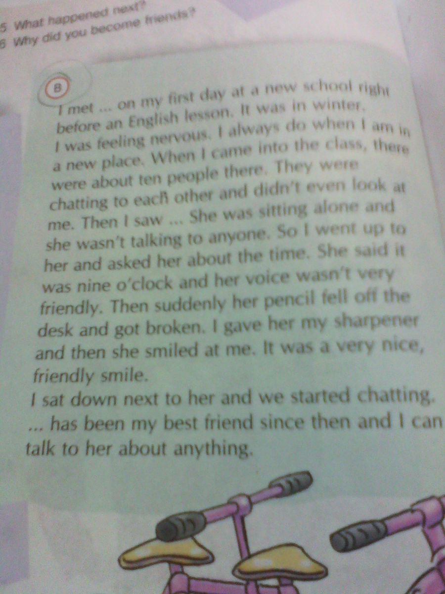 Я встретил ее в свой первый день в новой школе, сразу же после урока английского. Была зима. Я очень нервничал. Я всегда нервничаю, находясь в новом месте. Когда я зашел в класс, там было где-то 10 человек. Они болтали друг с другом и никто даже не глянул на меня. Потом я увидел ее. Она сидела одна и ни с кем не разговаривала. Я подошел к ней и спросил ее который час. Она ответила 9 часов и ее голос прозвучал не очень дружелюбно. Потом ее карандаш неожиданно упал на парту и разбился. Я дал ей свою точилку карандашей и она мне улыбнулась. Это была очень милая, дружелюбная улыбка.