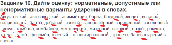 Задание 10. Дайте оценку: нормативные, допустимые или ненормативные варианты ударений в словах.