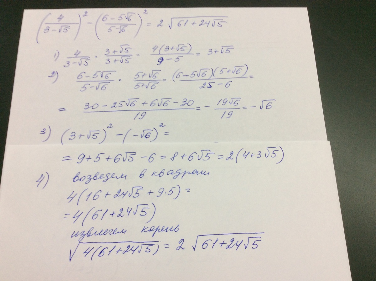 ((4/(3-sqrt5))^2)-((6-5(sqrt6))/(5-sqrt6))^2=2sqrt(61+24sqrt(5))