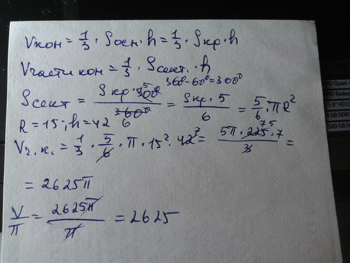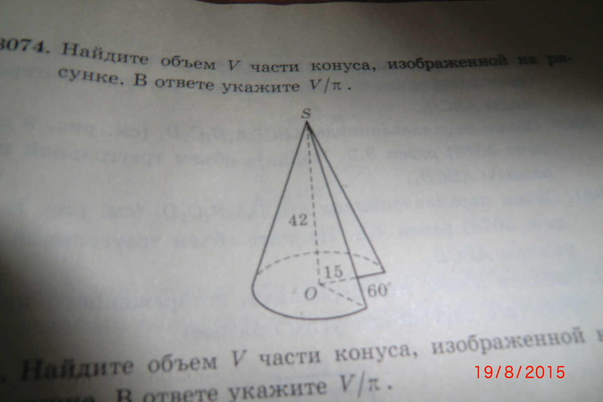 Найдите объем V части конуса, изображенной на рисунке. В ответе укажите V/Pi.R15 H42
