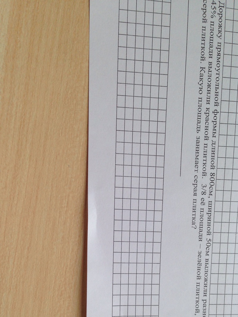 Дорожку прямоугольной формы длиной 800(см), шириной 50 см. выложили разноцветной плиткой. 45% площади выложили красной плиткой. 3/8 её площади- зеленойплиткой, а остальную площадь серой плиткой. Какую площадь занимает серая плитка?