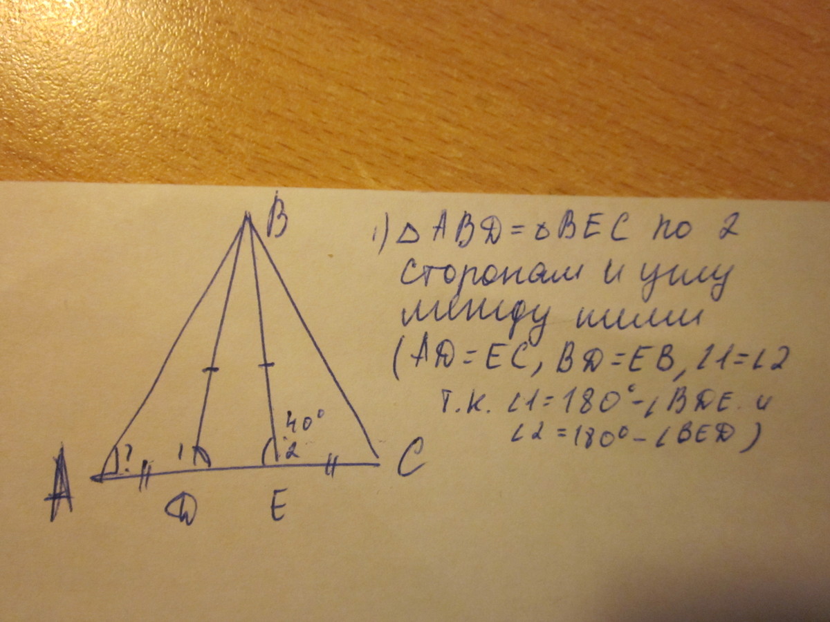 что треугольники равны это на фотке, а угол ВЕС не может быть 40, тк тогда угол ВЕА=180-40=140 градусов. А угол ВЕА=углу ВДЕ. В треугольнике ВЕД уже больше 180 градусов сумма углов получается