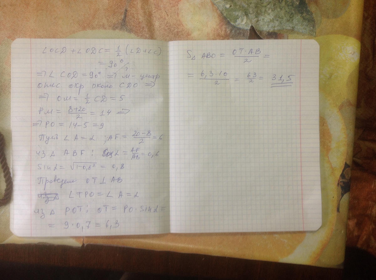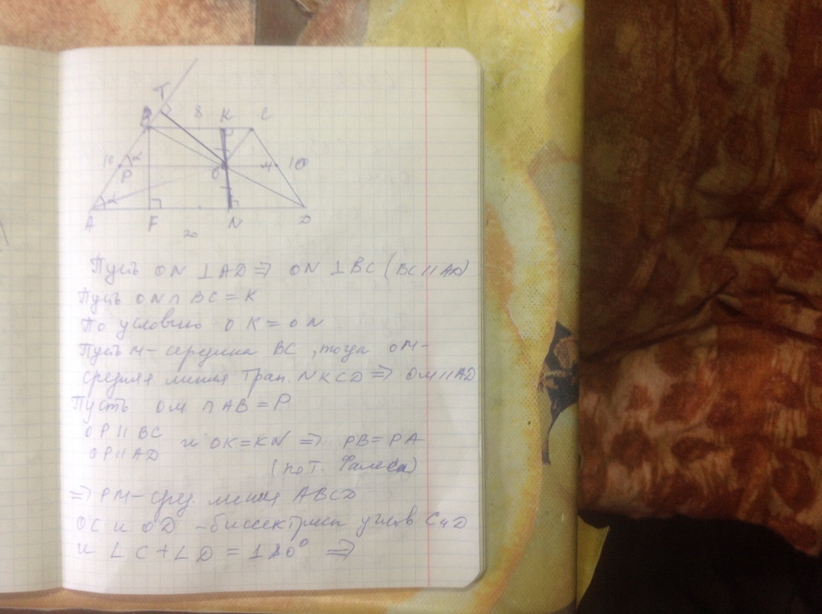 в равнобедренной трапеции с основаниями ВС=8 АД=20 и боковой стороной АВ=10. Окружность с центром в точке О касается ВС АД и СД. Найти площадь треугольника АВО