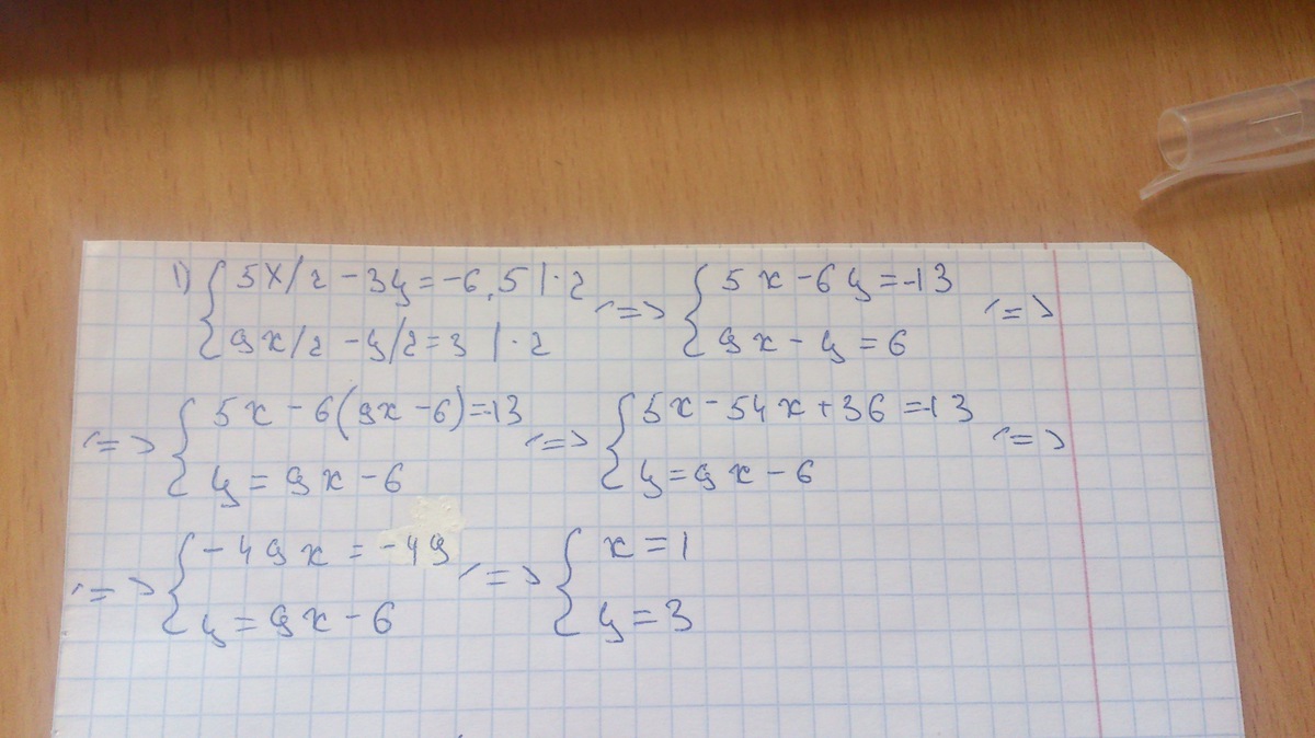 помогите пожалуйста!Решите систему уравнений с помощью подстановки 5x/2-3y=-6.5 (ниже) 9x/2-y/2=3.Второе задание.решите систему уравнений с помощью сложения 5(3x+1)-4(y-2)=66(ниже)6(2x+1)-3(2y-3)=51 и третье задание решите графический систему уравнений 3x+y=3(ниже) 2x-y=7 ОЧЕНЬ ПРОШУ ПОМОГИТЕ!