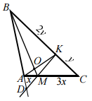 Точки К и М лежат на сторонах ВС и АС треугольника АВС, АМ : МС = 1 : 3 и ВК : КС = 2 : 1. Отрезки АК и ВМ пересекаются в точке О, а прямые АВ и КМ пересекаются в точке D.