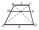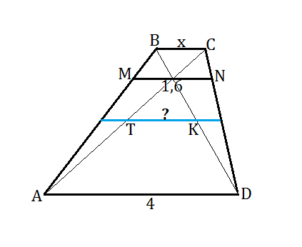 Отрезок MN параллелен основаниям АD и ВС трапеции АВСD и проходит через точку пересечения диагоналей. Известно что MN = 1,6 и АD = 4. Найти меньшее основание трапеции и расстояние между серединами диагоналей.