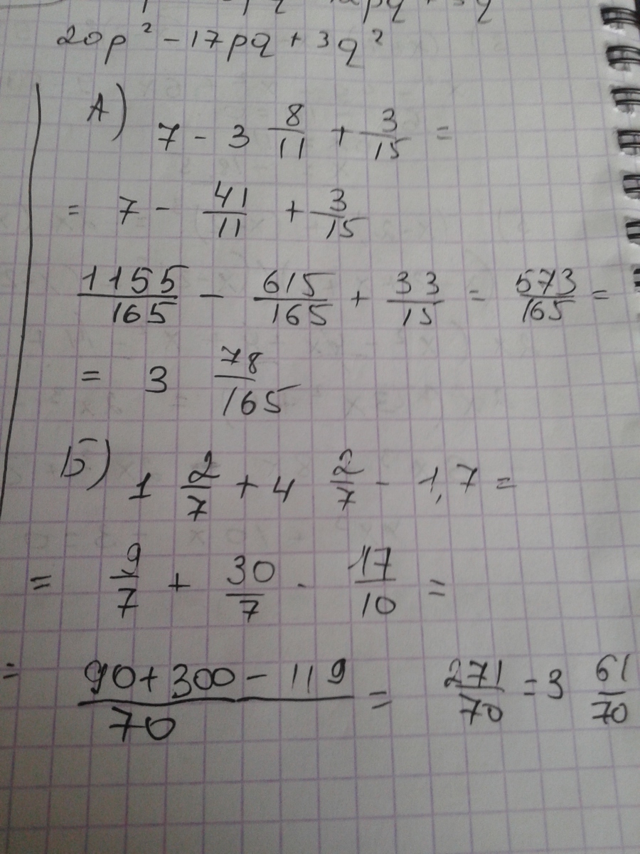 B)1 2/7+4 2/7-1,7=5 4/7-1,7=3 61/70