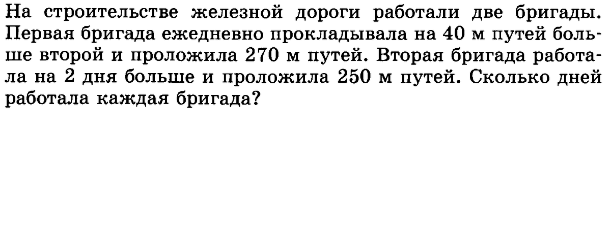 Пусть в день вторая бригада прокладывала х м пути, тогда вторая х+40 м. Первая работала у дней , а вторая у+2 дня