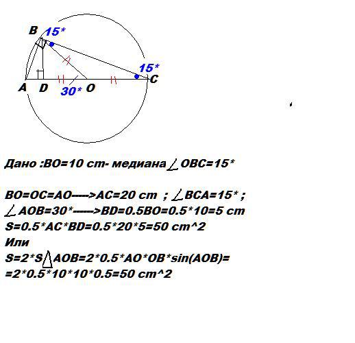 В прямоугольном треугольнике медиана, проведенная к гипотенузе, равна 10 и составляет угол 15 градусов с одним из катетов. Найти площадь треугольника.