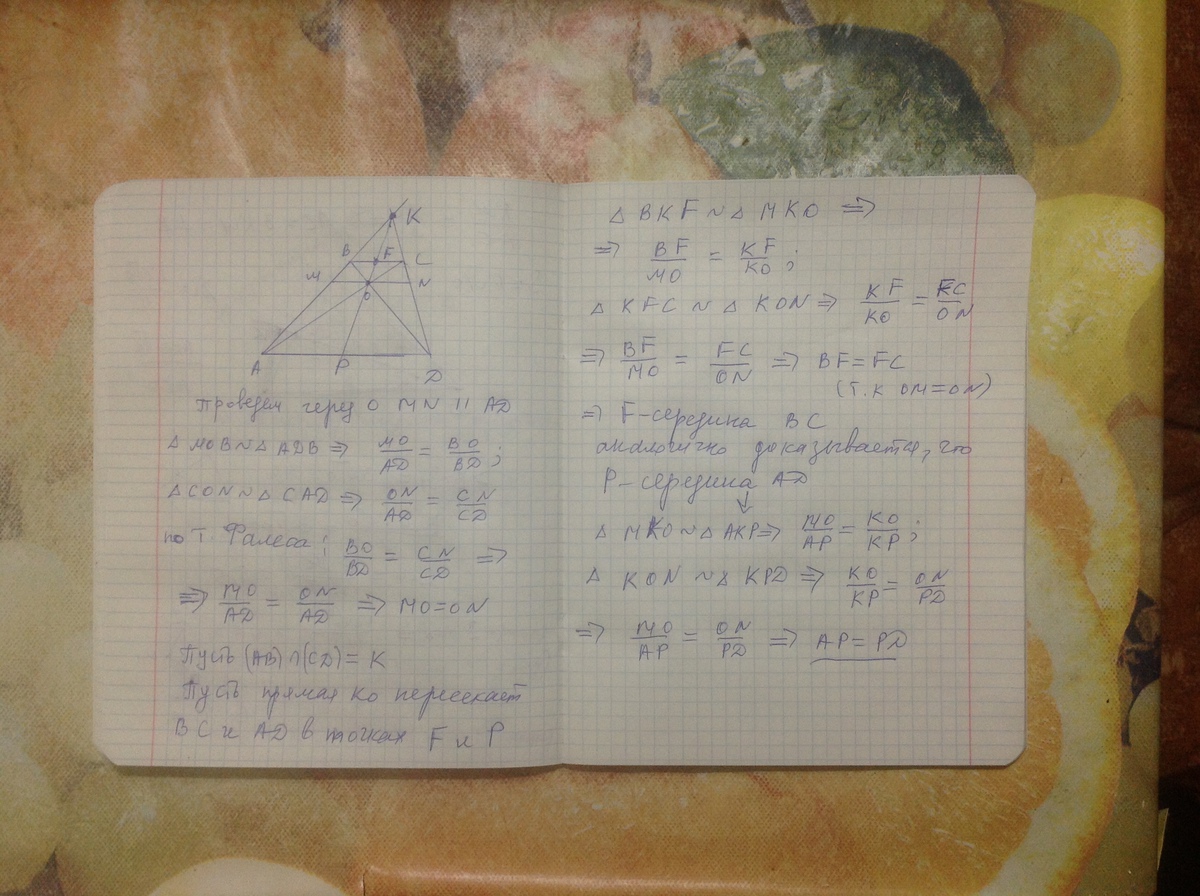 докажите что прямая проведенная через середины основания трапеций проходит через точку пересечения диагоналей трапеции и точку прододжения боковых сторон