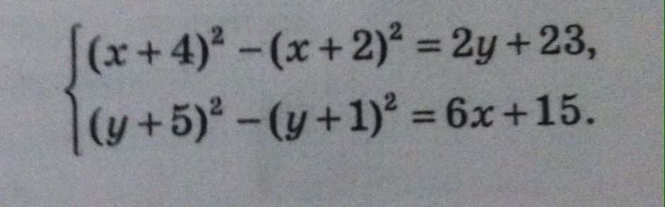 { (x + 4)^2 - (x + 2)^2 = 2y + 23