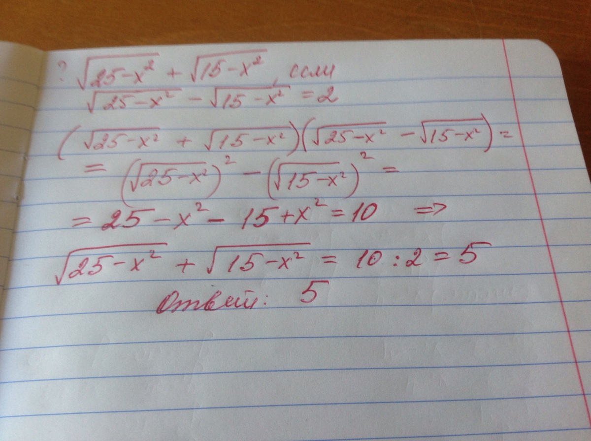 Чему равна сумма √(25-x^2) + √(15- x^2), если известно, что разность √(25- x^2)-√(15-x^2)=2, величину икс находить не нужно.