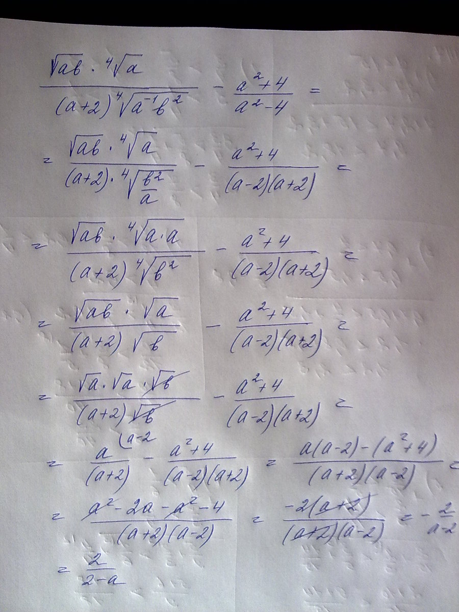 упростить выражение: ((кв. корень (аб) *корень четвертой степени из (а)): (а+2)*корень четвертой из(а^-1 степени*в^2))-а^2+4:а^2-4.....помогите пожалуйста