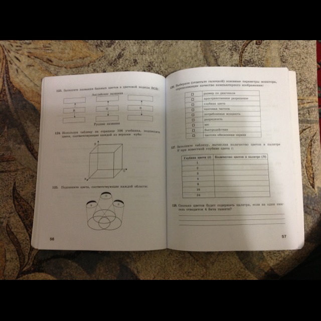 набор цветов - палитра, частота обновлений - кол-во обновлений, пиксель - точечный элемент, глубина цвета - длина кода, монитор - пиксели,