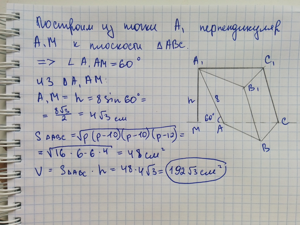 Найдите объём наклонной призмы, у которой основанием является треугольник со сторонами 10 см, 10 см и 12 см, а боковое ребро, равное 8 см, составляет с плоскостью основания угол в 60 градусов.
