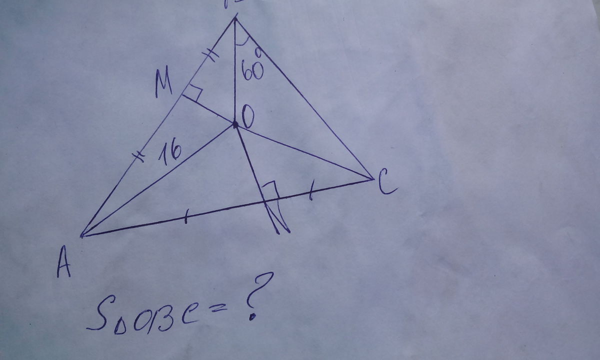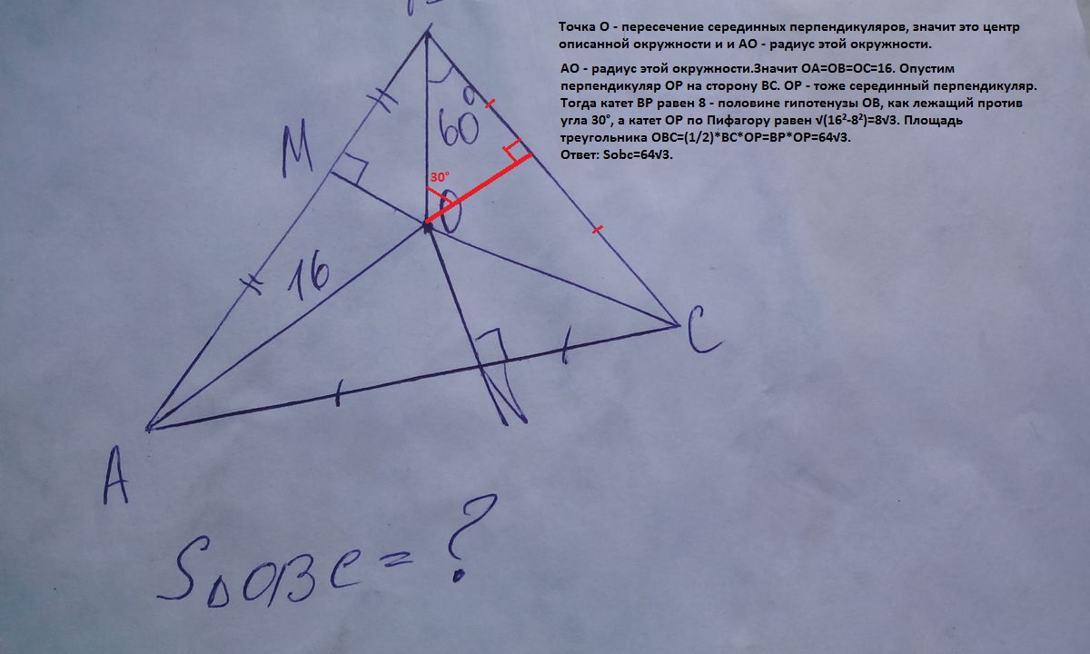 1) Точка О - пересечение серединных перпендикуляров, значит это центр описанной окружности и и АО - радиус этой окружности.Значит ОА=ОВ=ОС=16. Опустим перпендикуляр ОР на сторону ВС. ОР - тоже серединный перпендикуляр. Тогда катет ВР равен 8 - половине гипотенузы ОВ, как лежащий против угла 30°, а катет ОР по Пифагору равен √(16²-8²)=8√3. Площадь треугольника ОВС=(1/2)*ВС*ОР=ВР*ОР=64√3.