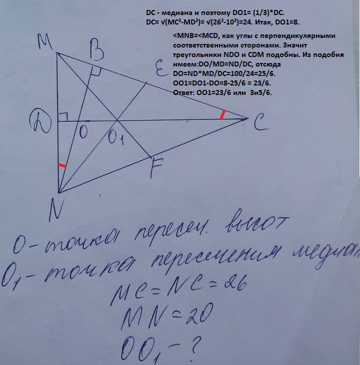 DC= √(MC²-MD²)= √(26²-10²)=24. Итак, DO1=8.