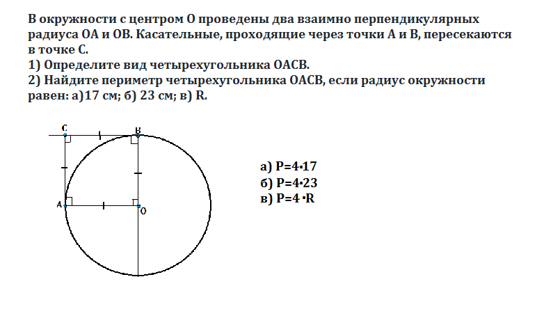 2) Найдите периметр четырехугольника ОАСВ, если радиус окружности равен: а)17 см; б) 23 см; в) R.