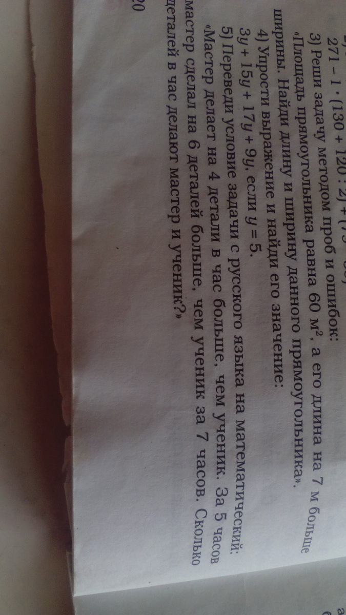 пусть ученик делает х деталей, тогда мастер (х+4) за час. Далее 5(х+4)-7х=6