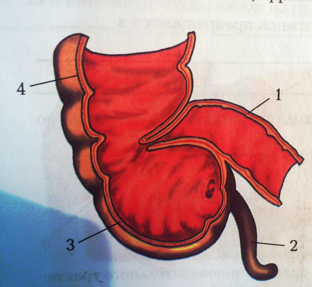 Напишите, какими цифрами обозначены на рисунке следующие структуры: Тонкая кишка, слепая кишка, аппендикс, восходящая ветвь толстой кишки