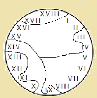 23. При раскопках на территории Древнего Рима были найдены необычные часы, циферблат которых имел 18 делений и для нумерации использовались римские цифры (см.рис.). К сожалению, циферблат часов оказался расколот на 5 частей. Юный археолог Никита заметил, что суммы чисел на каждой из частей равны между собой. Покажите, как мог разбиться циферблат. А вот здесь достаточно привести пример.