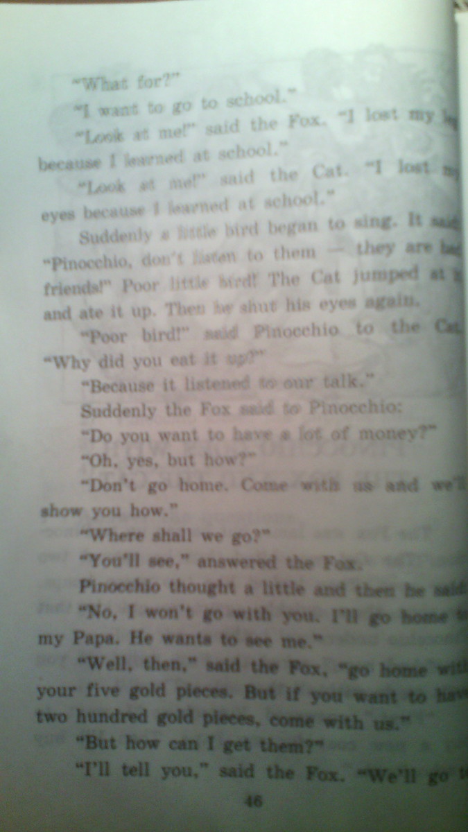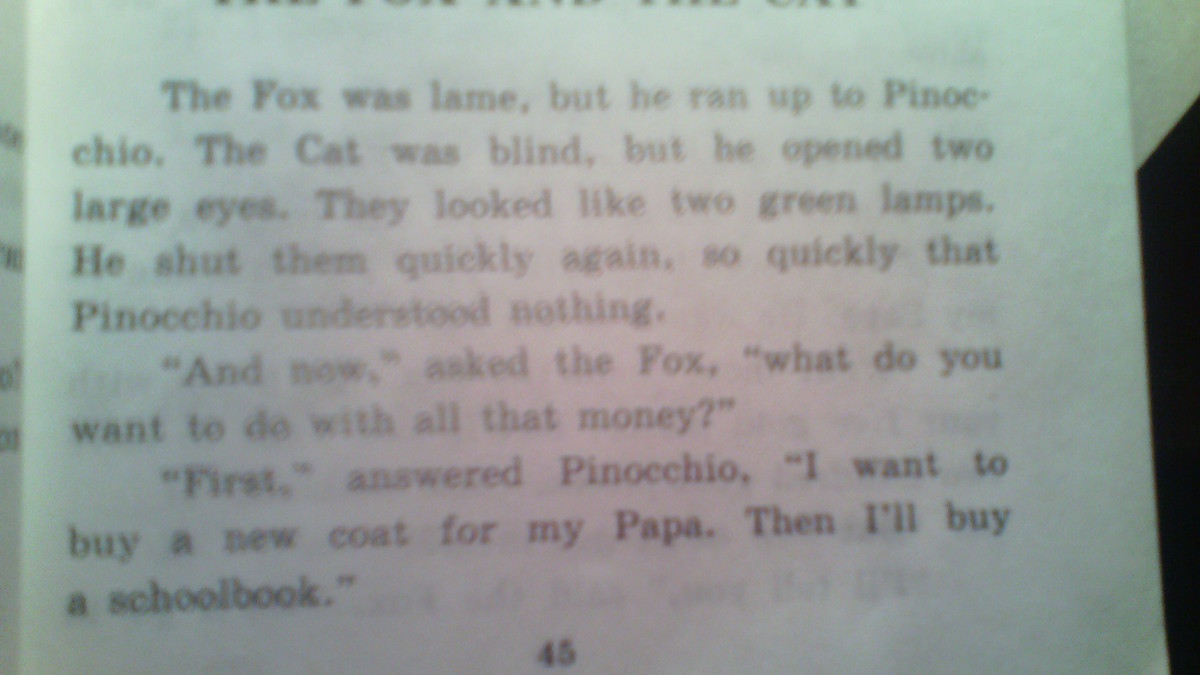 Лис был хромой, но подбежал к Пиноккио. Кот был слепой, но он открыл два широких глаза. Они (глаза) выглядели как две зелёные лампы. Он снова закрыл их так быстро, что Пиноккио ничего не понял. "А сейчас," -спросил Лис, "что ты собираешься делать со всеми этими деньгами?"