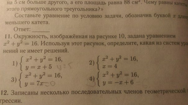 Графиком уравнения х2 + у2 =16 является окружность с центром в точке О ( 0;0 ), радиусом 4. Нужно начертить на координатной плоскости эту окружность и построить графики прямых , заданных вторыми уравнениями . Система 4 не имеет решений.