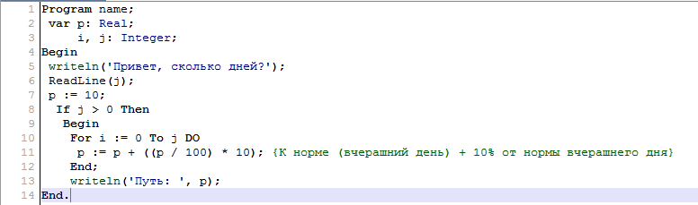Помогите решить задание (задачу) на языке паскаль. Начав тренировки, спортсмен в первый день пробежал 10 км. Каждый день он увеличивал дневную норму на 10% нормы предыдущего дня. Какой суммарный путь пробежит спортсмен за N дней? Разработать схему алгоритма для решения этой задачи.