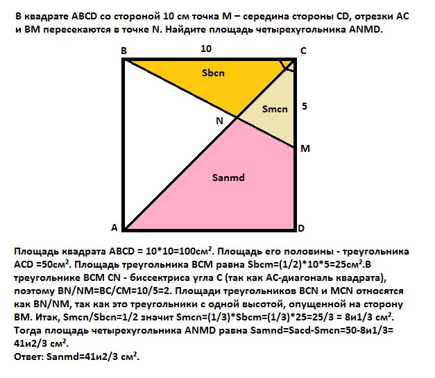 В квадрате ABCD со стороной 10 см точка M – середина стороны CD, от- резки AC и BM пересекаются в точке N. Найдите площадь четырехугольника ANMD.
