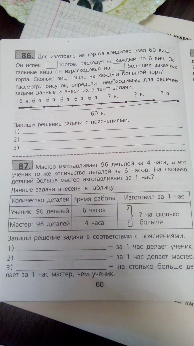 1 действие 6×6=36 2действие 60-36=24 3действие 24:3=8 ответ:на каждый большой торт пошло 8 яиц