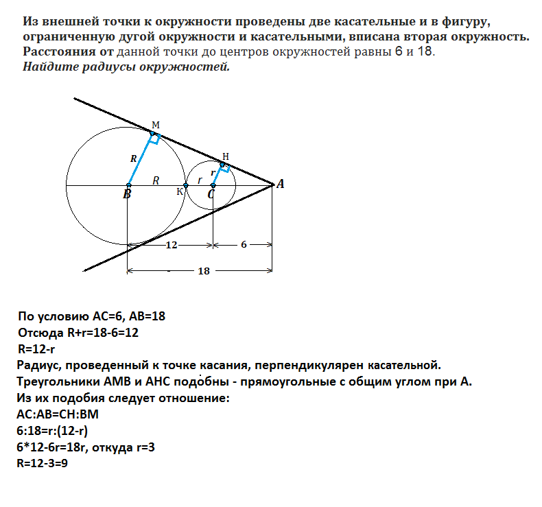 Из внешней точки к окружности проведены две касательные и в фигуру ,ограниченную дугой окружности и касательными,вписана вторая окружность.Расстояния от данной точки до центров окружностей равны 6 и 18.Найдите радиусы окружностей