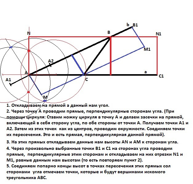4. Через произвольно выбранные точки В1 и С1 на сторонах угла проводим прямые, перпендикулярные этим сторонам и откладываем на них отрезки N1 и M1, равные данным нам высотам (то есть повторяем пункт 2).