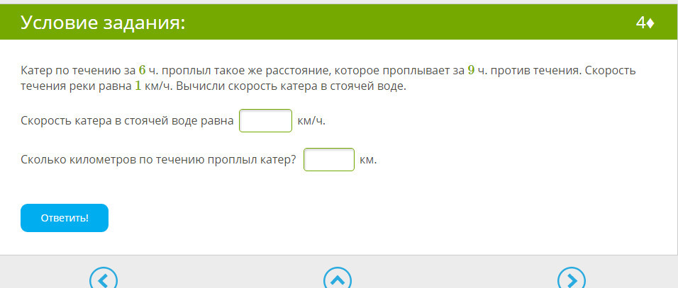 Катер по течению за 6 ч. проплыл такое же расстояние, которое проплывает за 9 ч. против течения. Скорость течения реки равна 1 км/ч. Вычисли скорость катера в стоячей воде.