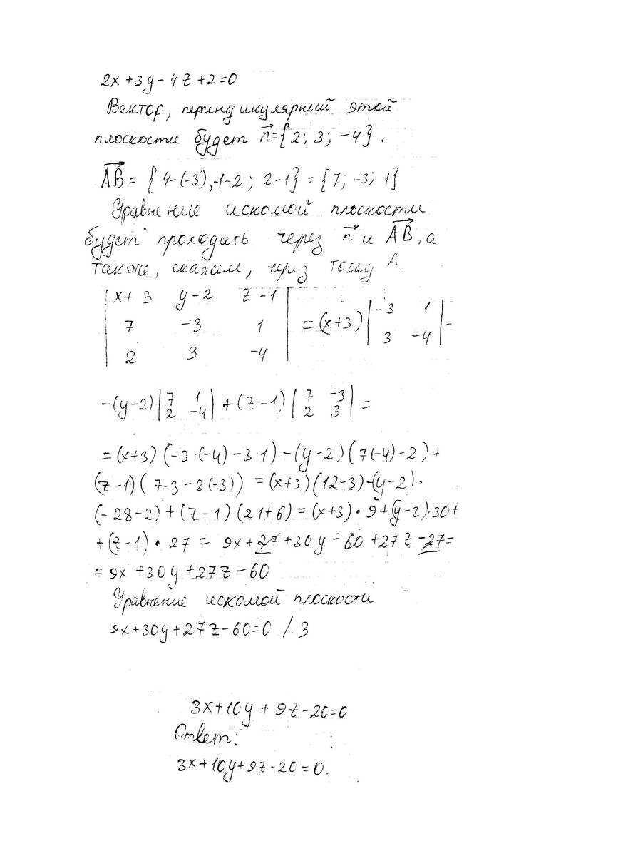 точки A(-3;2;1) и B(4;-1;2) перпендикулярно плоскости