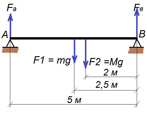 Сумма моментов относительно точки В: Fa*5 -F1*2,5- F2*2 = 0 Из этого уравнения Fa = (F1*2,5+ F2*2)/5 = (mg*2,5 + Mg*2)/5 = (400*10*2,5 + 500*10*2)/5 = 20000/5 = 4000 H.