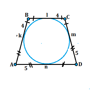 В равнобедренную трапецию с основаниями ad и bc вписана окружность. K,l,m,n- точки касания окружности со сторонами ab, bc, cd и ad соответственно. Найдите периметр трапеции abcd, если lc=4, nd=5
