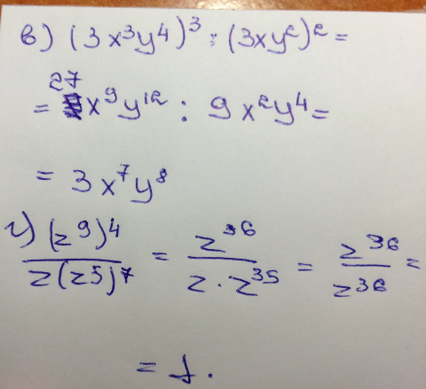 3. (3х^3*у^4)^3 / (3ху^2)^2 = 3х^9*у^12 / 3х^2*у^4=3х^7у^8