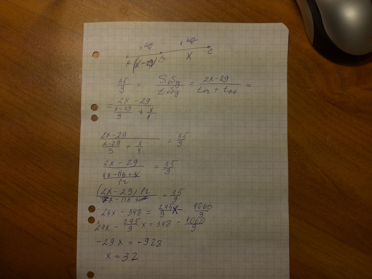 Турист шел из пункта А в пункт В со скоростью 3 км/час, а затем из пункта В в пункт С со скоростью 4 км/час. Чему равно расстояние от В до С, если известно, что расстояние от А до В на 29 км меньше, чем от В до С, и средняя скорость движения туриста оказалась равной 35/9 км/час. Составьте уравнение, соответствующее условию задачи, обозначив расстояние от В до С за х.
